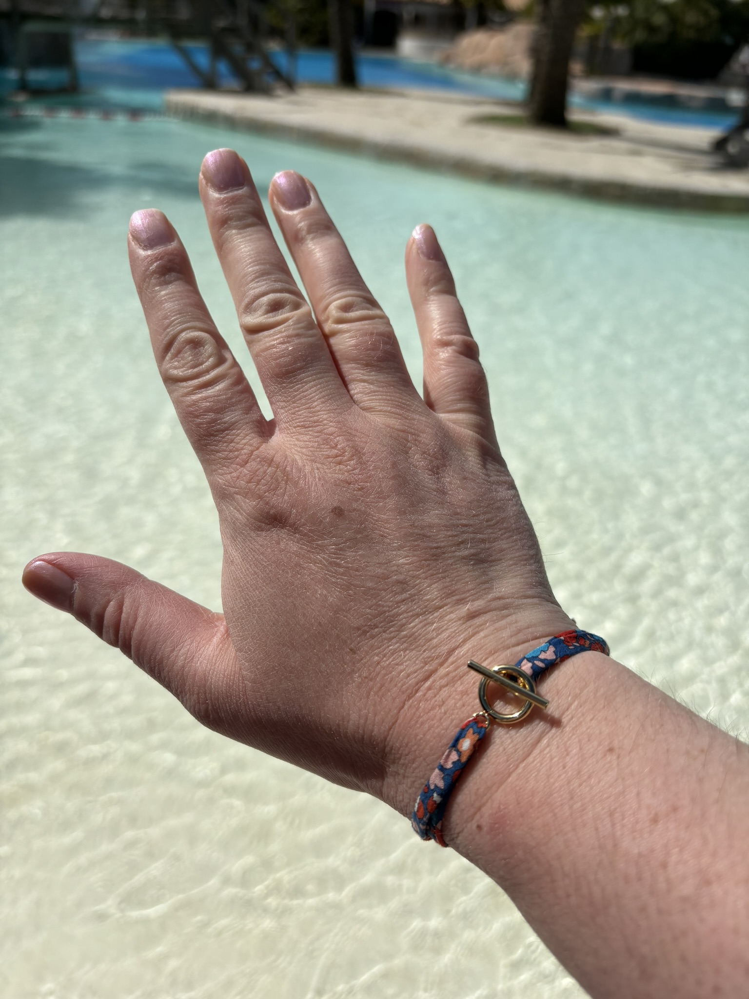 Très joli bracelet en tissu liberty et fermoir doré. Le plus : possibilité de le régler à sa taille.