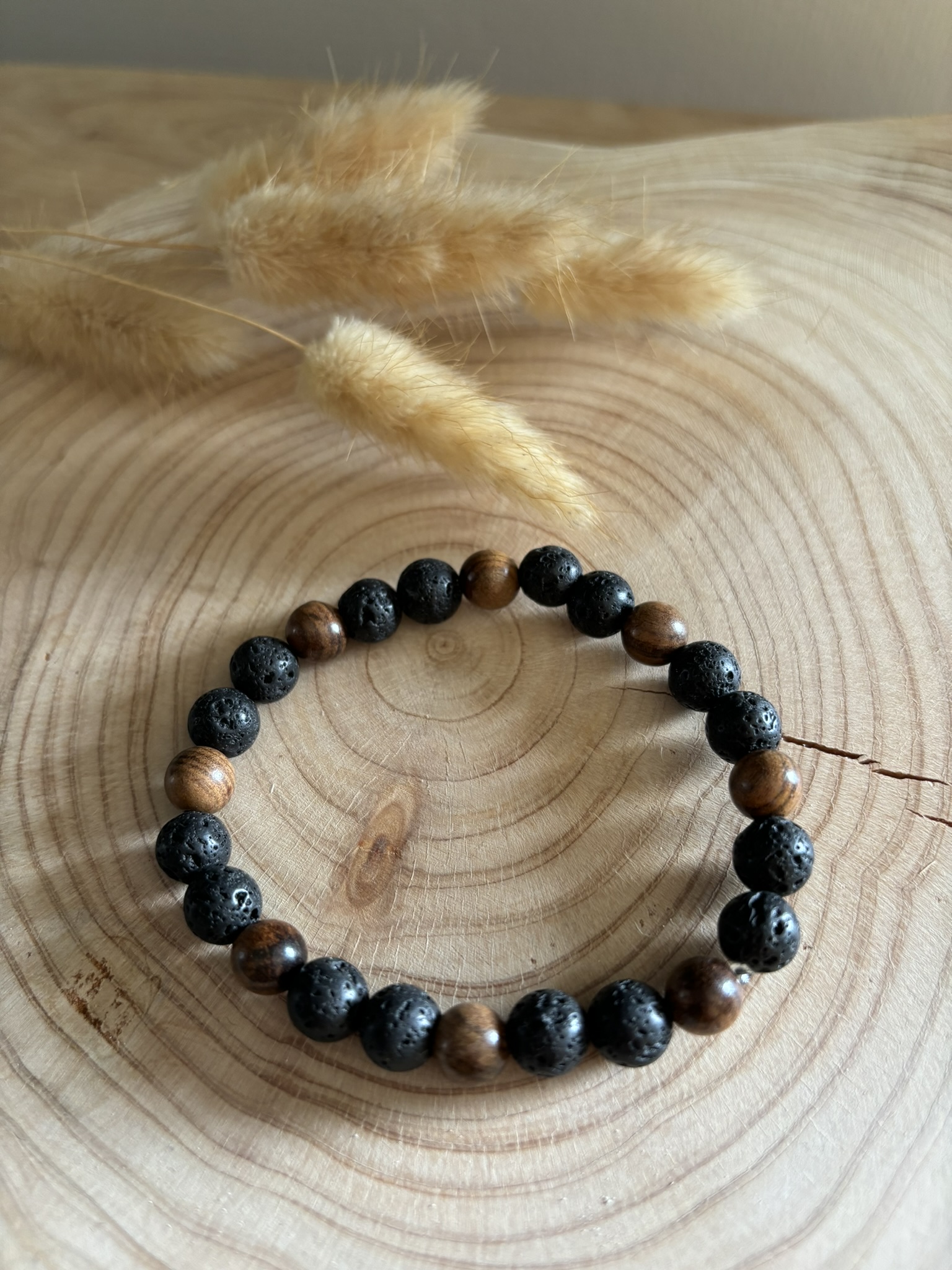 composé de perles rondes 8 mm en bois noir et en bois de santal, montées sur un fil élastique transparent