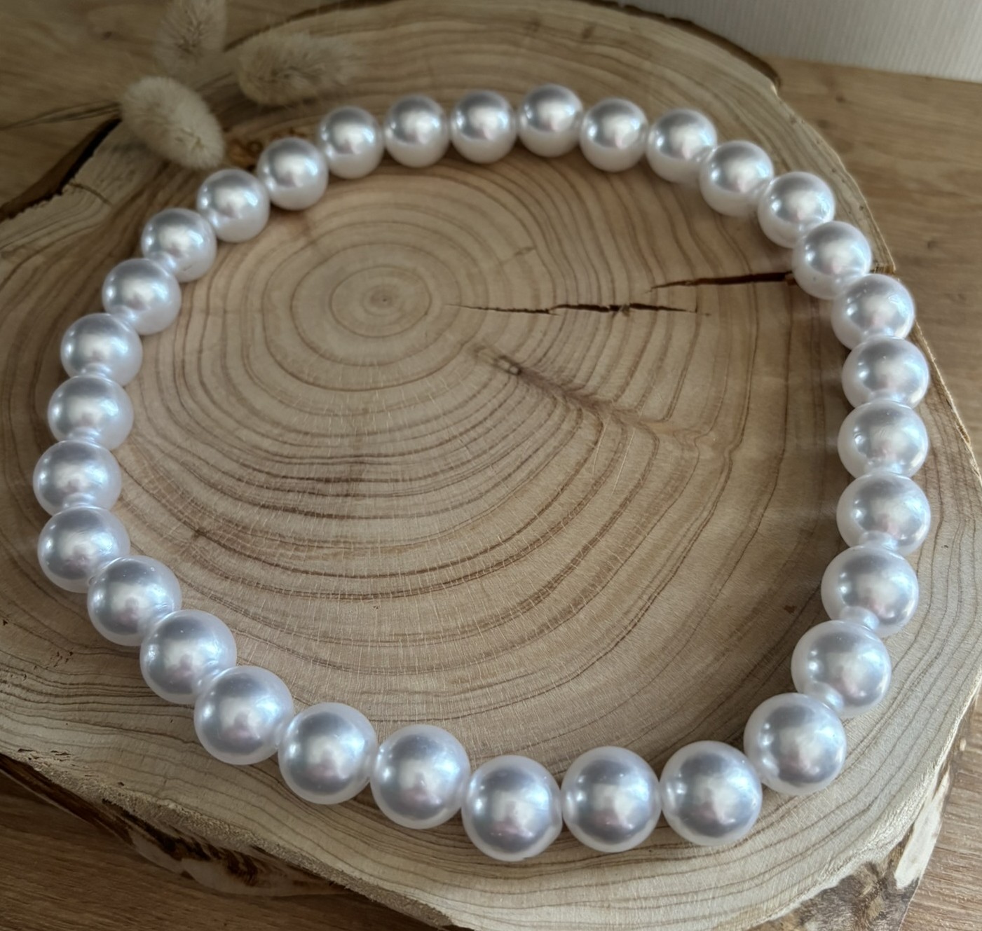Collier en perles rondes 16 mm imitation perles d’eau douce blanches nacrées montées sur un fil élastique transparent