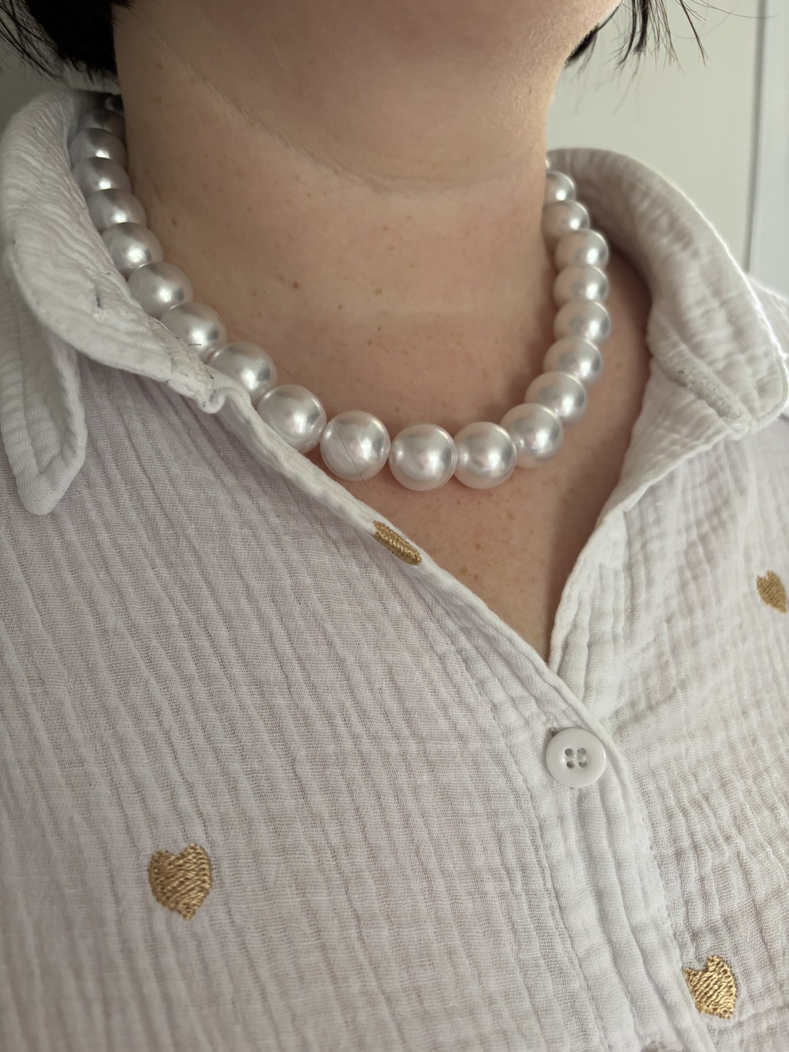 Collier Lily en perles rondes 16 mm imitation perles d’eau douce blanches nacrées montées sur un fil élastique transparent